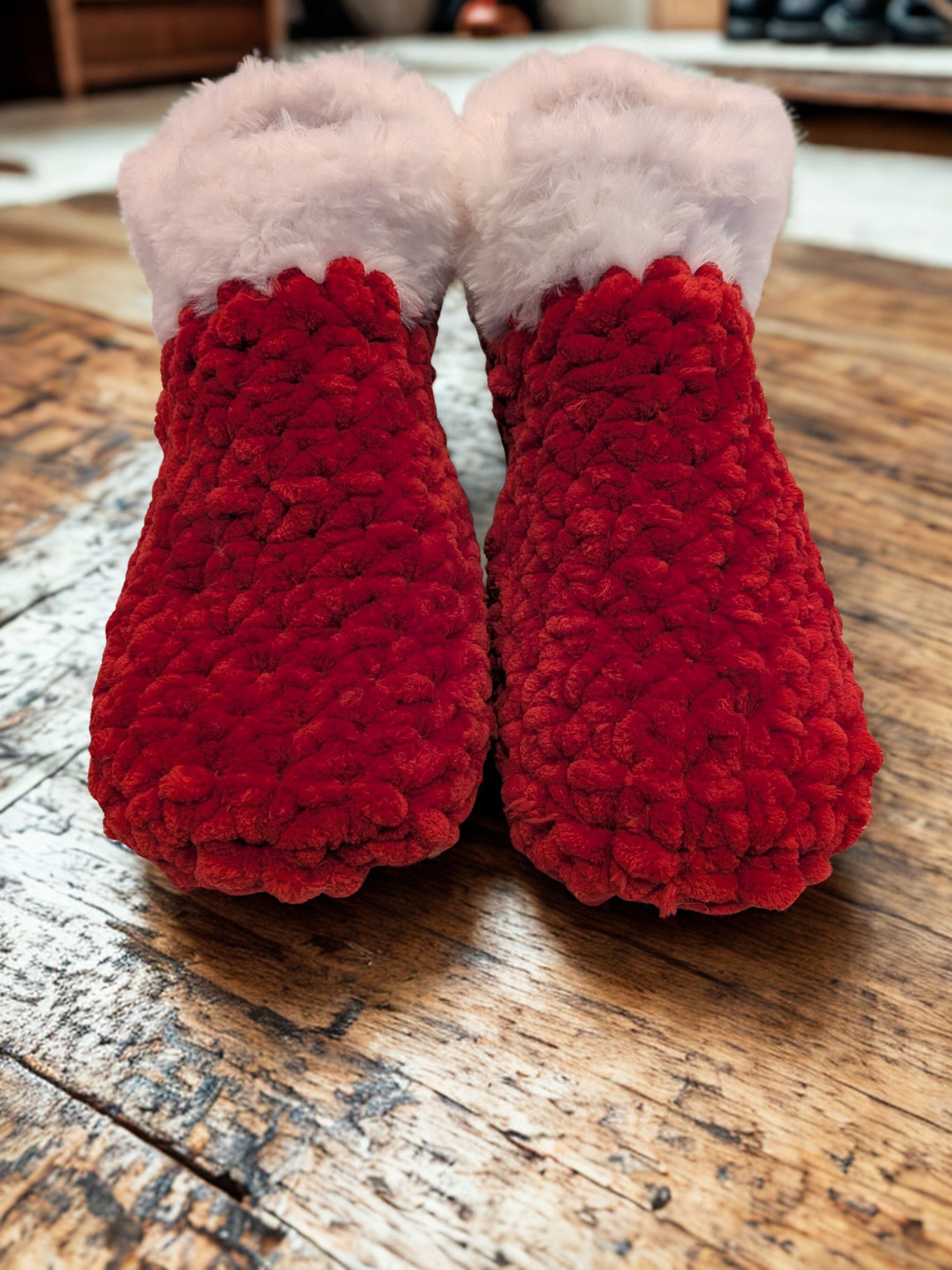 Keep your feet cozy and warm this holiday season with these beautiful, handmade fuzzy slippers. Crafted with a soft, velvet like yarn. Stylish Design: Features a chic faux fur trim around the ankle for a touch of elegance.
