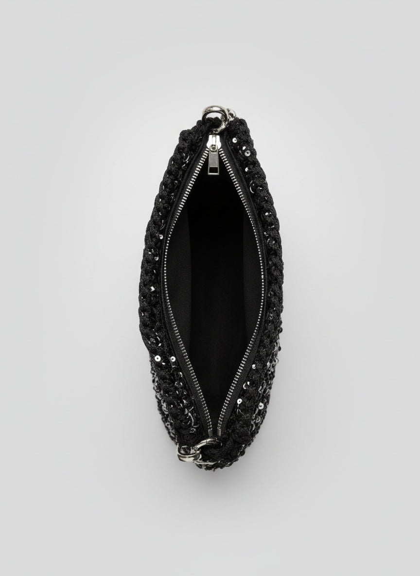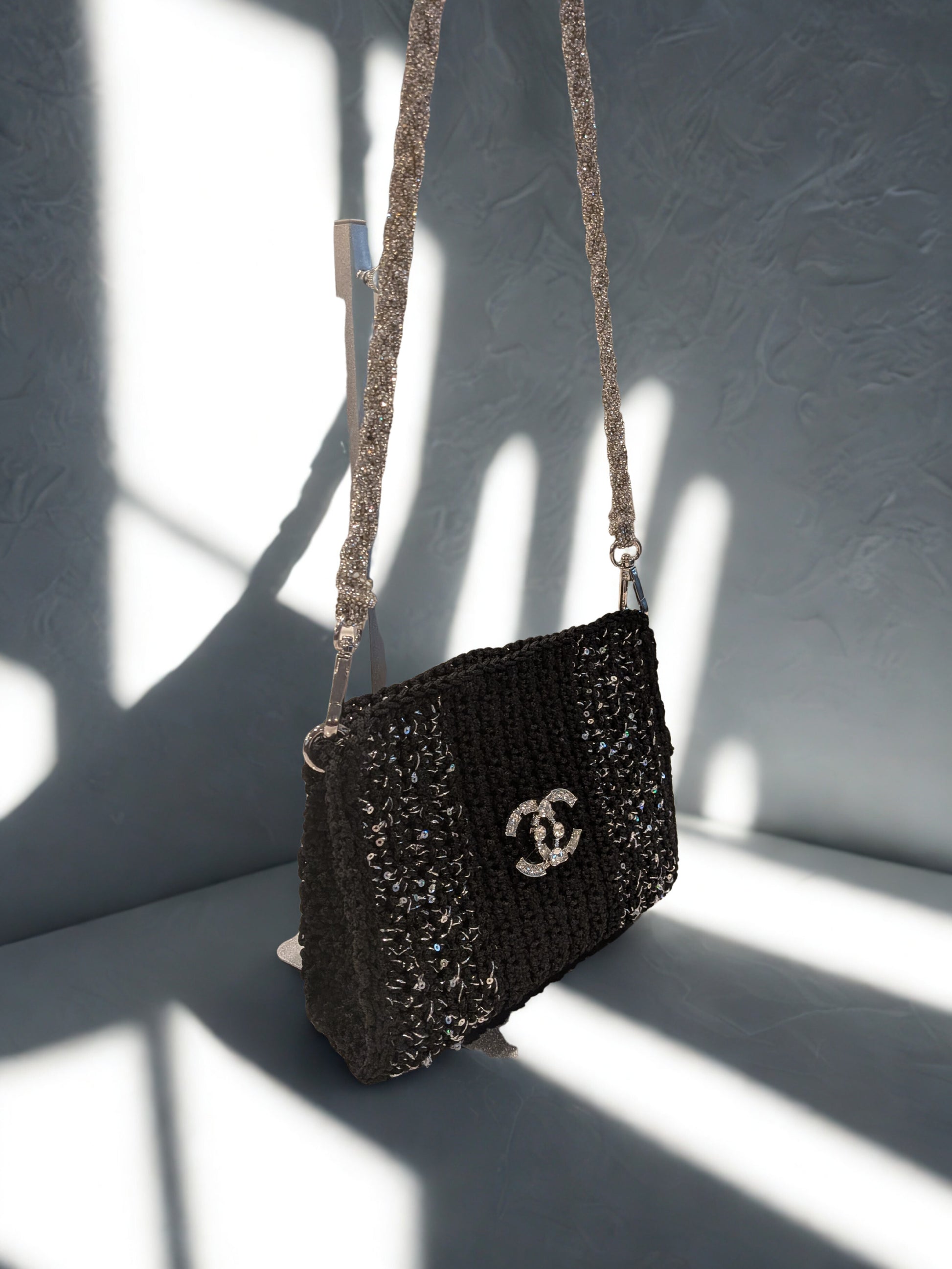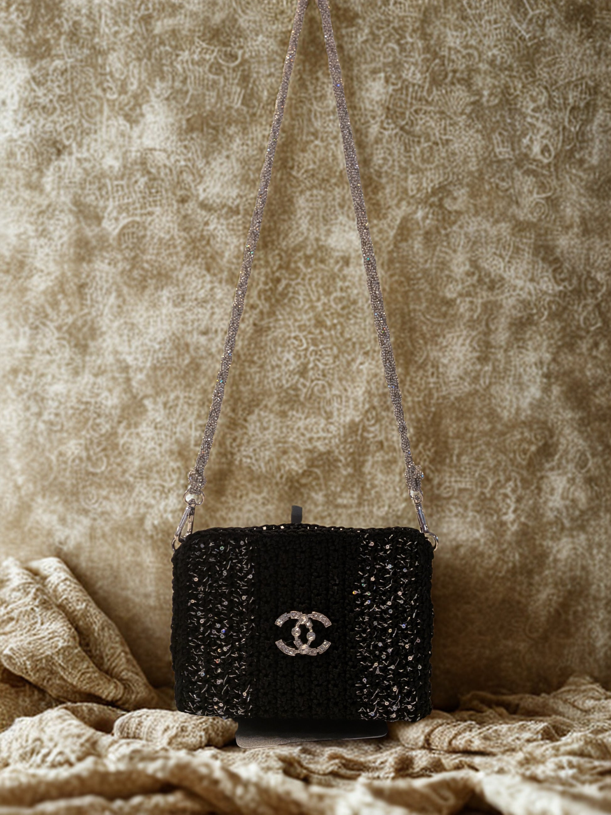 Step out in style with this unique and glamorous crochet handbag! Handcrafted with a lovely texture, this bag shimmers with integrated sequins or glitter, adding a touch of sparkle to any outfit. The look is completed with a dazzling, braided silver-toned strap that comfortably fits over the shoulder. Perfect for evenings out, special occasions, or adding a chic touch to your everyday ensemble.
